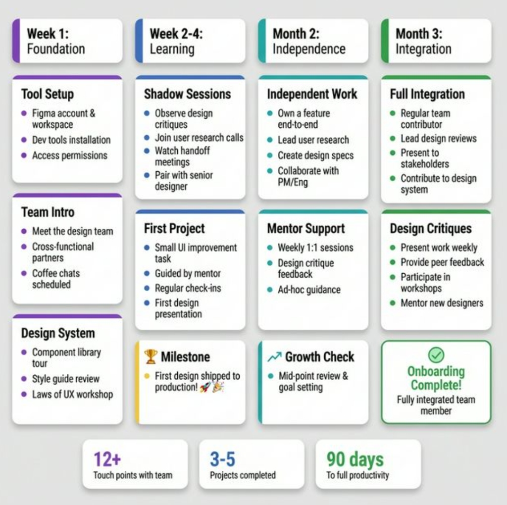 Key Steps 1 Week 1: Tool setup, team introductions, design system walkthrough, Laws of UX 2 Week 2-4: Shadow sessions, first small project assignment 3 Month 2: Independent project with mentor guidance 4 Month 3: Full integration with design reviews and critiques The Outcome Reduced ramp time, stronger team cohesion, and designers who ship independently within 90 days.